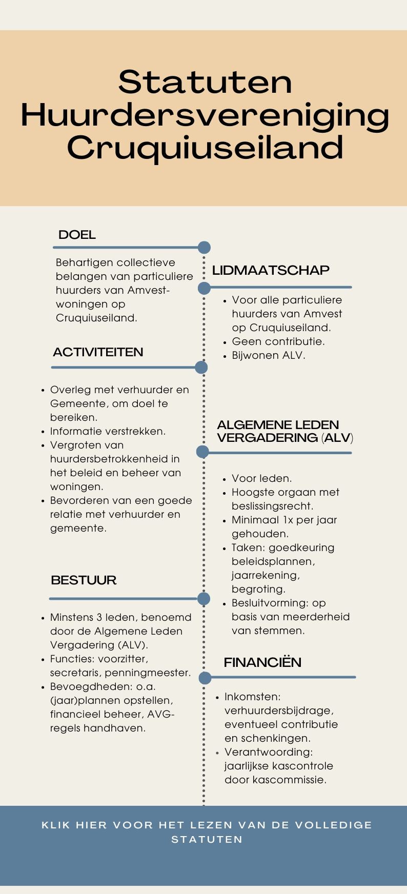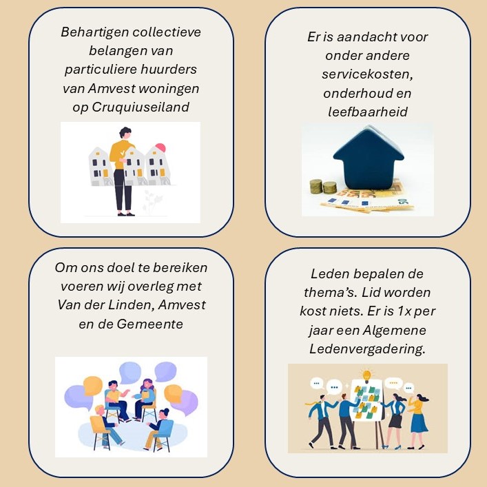 Huurdersvereniging Cruquiuseiland heeft als doel het behartigen van en opkomen voor de collectieve belangen van de particuliere Amvest-huurders. Momenteel (juni ’25) hebben al meer dan 90 huurders zich al aangesloten.
